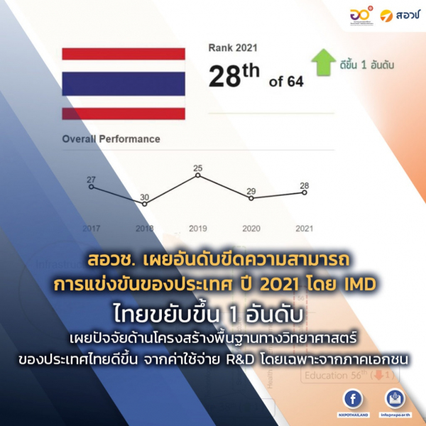 สำนักงานสภานโยบายการอุดมศึกษา วิทยาศาสตร์ วิจัยและนวัตกรรมแห่งชาติ (สอวช.) เปิดเผยผลการจัดอันดับขีดความสามารถในการแข่งขันของประเทศ โดย IMD World Competitiveness Center ประจำปี 2021