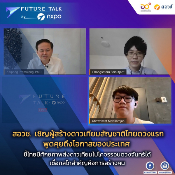 สำนักงานสภานโยบายการอุดมศึกษา วิทยาศาสตร์ วิจัยและนวัตกรรมแห่งชาติ (สอวช.) จัดรายการพูดคุยผ่านช่องทางออนไลน์ ถึงการเตรียมความพร้อมให้กับประเทศไทยรับมือกับเทรนด์การเปลี่ยนแปลงในอนาคต เพื่อมองหาและสร้างโอกาสให้กับประเทศผ่านการแลกเปลี่ยนมุมมองจากผู้เชี่ยวชาญและมีประสบการณ์ตรง ในรายการ Future Talk by NXPO ต่อเนื่องเป็นครั้งที่ 2 ในครั้งนี้เป็นการพูดคุยในประเด็น “ก้าวที่ยิ่งใหญ่ สู่อวกาศ กับ “ผู้สร้างดาวเทียม” สัญชาติไทยดวงแรก และความเป็นไปได้ในการสร้างยานอวกาศไปดวงจันทร์ในอีก 7 ปีข้างหน้า” ได้รับเกียรติจาก ดร. พงศธร สายสุจริต อาจารย์ประจำภาควิชาวิศวกรรมเครื่องกลและการบิน-อวกาศ มหาวิทยาลัยเทคโนโลยีพระจอมเกล้าพระนครเหนือ และรักษาการผู้อำนวยการสถาบันเทคโนโลยีอวกาศนานาชาติเพื่อการพัฒนาเศรษฐกิจประเทศไทย (INSTED) และนายชวัลวัฒน์ มาตรคำจันทร์ Sub Project Manager โครงการ BCC-SAT-1 และประธานนักเรียน UNISEC Thailand ร่วมพูดคุย ดำเนินรายการโดย ดร.กิติพงค์ พร้อมวงค์ ผู้อำนวยการ สอวช.