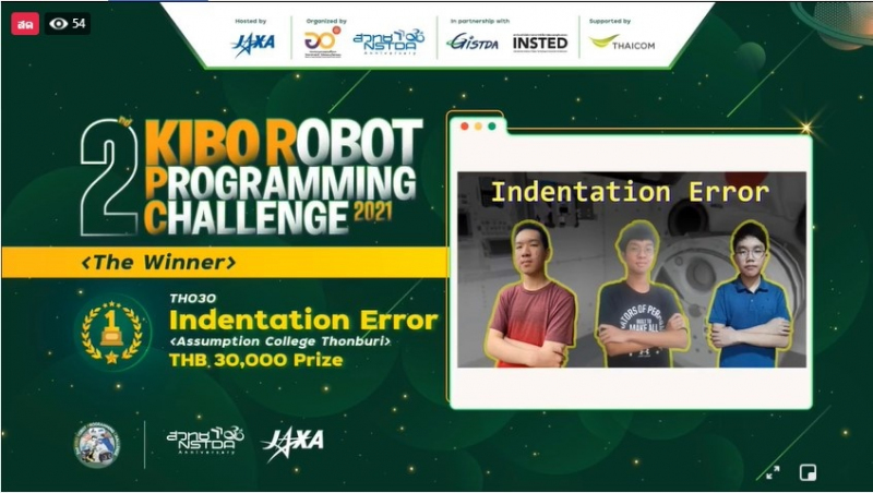 (14 กรกฎาคม 2564) Facebook Live เพจ NSTDA SPACE Education: กระทรวงการอุดมศึกษา วิทยาศาสตร์ วิจัยและนวัตกรรม (อว.) โดยสำนักงานพัฒนาวิทยาศาสตร์และเทคโนโลยีแห่งชาติ (สวทช.) ร่วมกับ องค์กรสำรวจอวกาศญี่ปุ่น หรือ แจ็กซา (Japan Aerospace Exploration Agency: JAXA) และหน่วยงานพันธมิตร ประกาศผลการแข่งขัน “โครงการ The 2nd Kibo Robot Programming Challenge” ผลปรากฏว่าได้ทีมอินเดนเทชัน เออเร่อ (Indentation Error) จากโรงเรียนอัสสัมชัญธนบุรี เป็นทีมชนะเลิศการแข่งขัน เป็นตัวแทนประเทศไทยเพื่อเข้าร่วมการแข่งขันรอบชิงแชมป์เอเชียทางออนไลน์ ถ่ายทอดสดจาก ศูนย์อวกาศสึกุบะ ประเทศญี่ปุ่น ที่จะจัดขึ้นในเดือนกันยายนนี้ กับภารกิจแข่งขันเขียนโปรแกรมควบคุมหุ่นยนต์ Astrobee ซึ่งเป็นหุ่นยนต์ผู้ช่วยนักบินอวกาศ ที่ปฏิบัติงานอยู่บนสถานีอวกาศนานาชาติ (International Space Station: ISS) ให้ปฏิบัติภารกิจตามที่ได้รับมอบหมาย