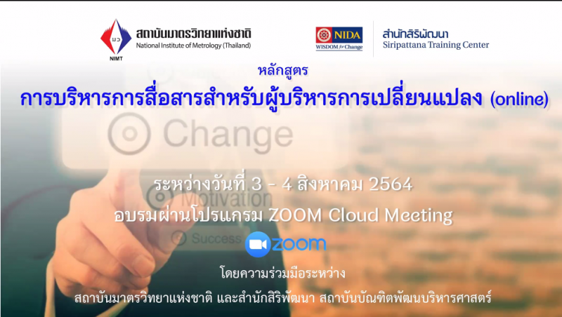 สถาบันมาตรวิทยาแห่งชาติ (มว.) กระทรวงการอุดมศึกษา วิทยาศาสตร์ วิจัยและนวัตกรรม (อว.) จึงได้ร่วมกับ สำนักสิริพัฒนา สถาบันบัณฑิตพัฒนบริหารศาสตร์ (NIDA) โดยกลุ่มงานบริหารและพัฒนาทรัพยากรบุคคล ฝ่ายบริหารกลาง มว. จึงได้จัดอบรมออนไลน์ในหัวข้อ การบริหารการสื่อสารสำหรับผู้บริหารการเปลี่ยนแปลง ระหว่างวันที่ 3-4 สิงหาคม 2564 บรรยายให้ความรู้โดยรองศาสตราจารย์ ดร.จุฑาพรรธ์  ผดุงชีวิต จากสถาบันบัณฑิตพัฒนาบริหารศาสตร์  โดยมีวัตถุประสงค์เพื่อให้ผู้เข้าอบรมได้เรียนรู้หลักการของการสื่อสารเชิงกลยุทธ์ การออกแบบการสื่อสารอย่างมีประสิทธิภาพ  ได้เรียนรู้และพัฒนาทักษะการสื่อหสารสำหรับผู้บริหารการเปลี่ยนแปลง  รวมทั้งยังได้พัฒนาองค์ความรู้ ทัศนคติ มุมมอง รูปแบบพัฤติกรรมทางการสื่อสารในมิติการนำเสนออย่างมืออาชีพ  การอบรมดังกล่าวจัดขึ้นแบบออนไลน์ ณ สถาบันมาตรวิทยาแห่งชาติ มว. จ.ปทุมธานี