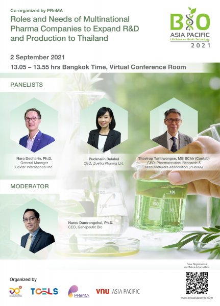 กระทรวงการอุดมศึกษา วิทยาศาสตร์ วิจัยและนวัตกรรม (อว.) โดย ศูนย์ความเป็นเลิศด้านชีววิทยาศาสตร์ (องค์การมหาชน) หรือ ทีเซลส์ (TCELS) ร่วมกับ สมาคมผู้วิจัยและผลิตเภสัชภัณฑ์ (พรีม่า) จัดสัมมนาหัวข้อ "Roles and Needs of Multinational Pharma Companies to Expand R&D and Production to Thailand" ในงาน Bio Asia Pacific 2021 โดยร่วมพูดคุยแลกเปลี่ยนความคิดเห็นถึงบทบาทและโอกาสของบริษัทยาระดับโลก ในการขยายลงุทนด้านการวิจัย พัฒนา และการผลิตมาที่ประเทศไทย อะไรเป็นปัจจัยที่สำคัญในการตัดสินใจ