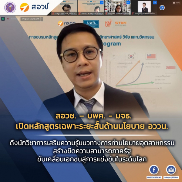 สำนักงานสภานโยบายการอุดมศึกษา วิทยาศาสตร์ วิจัยและนวัตกรรมแห่งชาติ (สอวช.) ร่วมกับหน่วยบริหารและจัดการทุนด้านการพัฒนากำลังคน และทุนด้านการพัฒนาสถาบันอุดมศึกษา การวิจัยและการสร้างนวัตกรรม (บพค.) และสถาบันนโยบายวิทยาศาสตร์ เทคโนโลยีและนวัตกรรม (STIPI) มหาวิทยาลัยเทคโนโลยีพระจอมเกล้าธนบุรี (มจธ.) จัดอบรมหลักสูตรระยะสั้น เฉพาะทางด้านนโยบายวิทยาศาสตร์ วิจัยและนวัตกรรม ผ่านระบบออนไลน์ ระหว่างวันที่ 6-23 กันยายน 2564 เพื่อให้บุคลากรที่เกี่ยวข้องกับการพัฒนาการอุดมศึกษา วิทยาศาสตร์ วิจัยและนวัตกรรม (อววน.) ได้มีโอกาสรับทราบนโยบายและมาตรการ รวมถึงกลไกที่เกี่ยวข้องกับการพัฒนาระบบ อววน. และร่วมแลกเปลี่ยนประสบการณ์กับผู้ทรงคุณวุฒิ และผู้เข้าร่วมอบรมจากหน่วยงานต่างๆ ซึ่งจะเป็นประโยชน์ต่อการทำงาน และการสร้างเครือข่ายในการทำงานในอนาคต สำหรับการอบรมวันแรกในหลักสูตรการจัดการเทคโนโลยีและนวัตกรรม (Technology and Innovation Management)ได้รับเกียรติจาก ดร. แบ๊งค์ งามอรุณโชติ STIPI มจธ. เป็นผู้บรรยายในหัวข้อ “นโยบายอุตสาหกรรมเพื่อการไล่กวดทางเทคโนโลยีสำหรับประเทศกำลังพัฒนา (Industrial Policy for Technology Catching-up in Developing Countries)” มีผู้เข้าร่วมการอบรมกว่า 60 คน