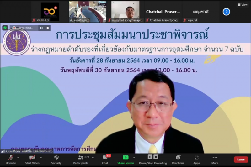 สำนักงานปลัดกระทรวงการอุดมศึกษา วิทยาศาสตร์ วิจัยและนวัตกรรม จัดการประชุมประชาพิจารณ์ร่างกฎหมายลำดับรองทั้ง 7 ฉบับ เพื่อรับฟังความคิดเห็นจากสถาบันอุดมศึกษา ผู้เรียน คณาจารย์ ผู้ใช้บัณฑิต ผู้มีส่วนได้ส่วนเสีย สภาวิชาชีพและผู้สนใจทั่วไป เพื่อนำมาเป็นข้อมูลในการดำเนินการจัดทำกฎหมายลำดับรองว่าด้วยมาตรฐานการอุดมศึกษา ตามพระราชบัญญัติการอุดมศึกษา พ.ศ. 2562 ต่อไป โดยจัดขึ้นในวันที่ 28 และ 30 กันยายน 2564 ผ่านสื่ออิเล็กทรอนิกส์