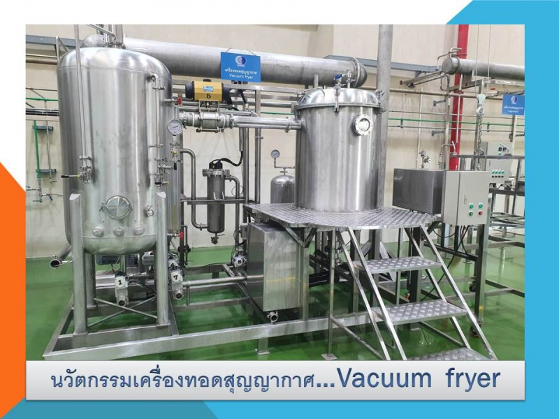 เครื่องทอดสุญญากาศ หรือ Vacuum fryer มีปริมาณการทอดต่อรอบ 65 กิโลกรัม/ครั้ง สร้างระดับสุญญากาศสูงสุดได้ถึง -720 มิลลิเมตรปรอท อุณหภูมิที่ใช้ในการทอด 80-95 องศาเซลเซียส โดยใช้เวลาทอด 60-80 นาที/ครั้ง (ขึ้นกับประเภทวัตถุดิบ) ปริมาณน้ำมันที่ใช้ในการทอดต่อรอบจำนวน 600 ลิตร สามารถนำน้ำมันมาใช้ทอดซ้ำได้ถึง 20 ครั้งต่อน้ำมัน 1 รอบ โดยน้ำมันยังมีประสิทธิภาพดีและปลอดภัยต่อสุขภาพ ระบบสลัดน้ำมันภายหลังการทอดใช้เวลา 25 นาที กำลังการผลิตต่อการใช้น้ำมัน 1 รอบ (600 ลิตร) ประมาณ 1,000-1,300 กิโลกรัม โดยผลิตภัณฑ์ที่ผ่านการทอดมีคุณภาพสม่ำเสมอ ไม่อมน้ำมัน ถูกหลักอนามัย มีอายุการเก็บรักษาได้ 1 ปี และคุณภาพผลิตภัณฑ์ด้านกลิ่น สี รสชาติ ยังคงใกล้เคียงธรรมชาติ