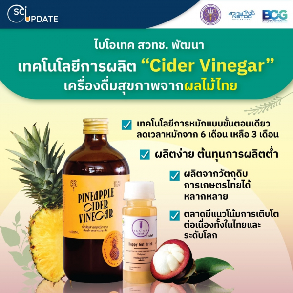 ศูนย์พันธุวิศวกรรมและเทคโนโลยีชีวภาพแห่งชาติ (ไบโอเทค) สำนักงานพัฒนาวิทยาศาสตร์และเทคโนโลยีแห่งชาติ (สวทช.) ได้พัฒนาเทคโนโลยีการผลิต Cider vinegar แบบขั้นตอนเดียว สำหรับวัตถุดิบการเกษตรของไทย โดยเป็นกระบวนการผลิตแบบง่ายและต้นทุนต่ำ ช่วยส่งเสริมให้ผู้ประกอบการรายย่อย (SMEs) สามารถเข้าถึงการใช้เทคโนโลยีแปรรูปสินค้าการเกษตรเพื่อสร้างมูลค่าเพิ่มได้