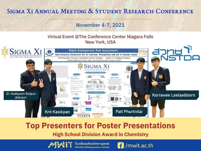 สำนักงานพัฒนาวิทยาศาสตร์และเทคโนโลยีแห่งชาติ สวทช. ฝ่ายส่งเสริมและพัฒนาเด็กและเยาวชนที่มีศักยภาพสูง โครงการการประกวดโครงงานของนักวิทยาศาสตร์รุ่นเยาว์ (Young Scientist Competition: YSC) ขอแสดงความยินดีกับเยาวชนโครงการ YSC นายกฤษฎิ์ กสิกพันธุ์ นายพัฒฒ์ พฤฒิวิลัย และ นายกรวีร์ ลีลาอดิศร นักเรียนโรงเรียนมหิดลวิทยานุสรณ์ โดยมี ดร. เกียรติภูมิ รอดพันธ์ ที่ปรึกษาโครงงาน ในการนำผลงาน โครงงาน Rapid Osteoporosis Risk Assessment: Non-Invasive Detection Kit of Calcium, Phosphate and pH in Human Sweat คว้ารางวัล Top Presenters ในการนำเสนอภาคโปสเตอร์ระดับมัธยมศึกษาตอนปลาย ในสาขาเคมี จากการประชุมวิชาการระดับนานาชาติ Sigma Xi Annual Meeting & Student Research Conference พร้อมรับสิทธิ์เป็นสมาชิก Sigma Xi องค์กรวิทยาศาสตร์ระดับโลกซึ่งจัดขึ้นระหว่างวันที่ 4-7 พฤศจิกายน พ.ศ. 2564 ในรูปแบบออนไลน์ ณ The Conference Center Niagara Falls รัฐนิวยอร์ก สหรัฐอเมริกา