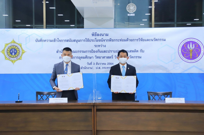 วันที่ 3 ธันวาคม 2564 ศ.ดร.นพ.สิริฤกษ์ ทรงศิวิไล ปลัดกระทรวงการอุดมศึกษา วิทยาศาสตร์ วิจัยและนวัตกรรม พร้อมด้วย นายวิชัย ไชยมงคล เลขาธิการคณะกรรมการป้องกันและปราบปรามยาเสพติด ร่วมลงนามในบันทึกความเข้าใจความร่วมมือทางวิชาการ (MOU) การสนับสนุนการใช้ประโยชน์จากพืชกระท่อมด้วยการวิจัยและนวัตกรรม ระหว่าง สำนักงานคณะกรรมการป้องกันและปราบปรามยาเสพติด กับ กระทรวงการอุดมศึกษา วิทยาศาสตร์ วิจัยและนวัตกรรม ณ สำนักงานคณะกรรมการป้องกันและปราบปรามยาเสพติด ดินแดง
