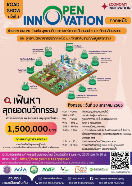 เปิดรับสมัครผู้ประกอบการ เข้าร่วมกิจกรรม Open Innovation Road Show ภาคเหนือ ครั้งที่ 4 เพื่อเข้าฟังเเนะนำกลไกการสนับสนุนทุนนวัตกรรมเเบบเปิด (Open innovation) วงเงินสนับสนุนสูงสุด 1.5 ลบ. สำหรับการทำต้นเเบบนวัตกรรม