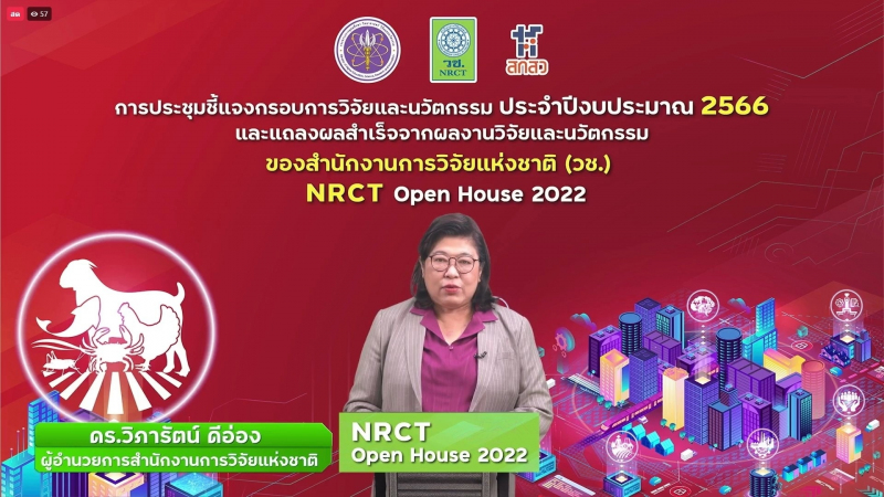 วันที่ 19 มิถุนายน 2565 สำนักงานการวิจัยแห่งชาติ (วช.) กระทรวงการอุดมศึกษา วิทยาศาสตร์ วิจัยและนวัตกรรม จัดการประชุมชี้แจงกรอบการวิจัยและนวัตกรรมประจำปีงบประมาณ 2566 การแถลงผลสำเร็จจากผลงานวิจัยและนวัตกรรม และแนวทางการเขียนและพิจารณาข้อเสนอการวิจัยและนวัตกรรม ด้านสัตว์เศรษฐกิจ NRCT Open House 2022 “วิจัยและนวัตกรรมในประเด็นท้าทายของประเทศ” เพื่อเป็นเวทีแลกเปลี่ยนประสบการณ์การเขียนข้อเสนอการวิจัยและนวัตกรรมและการยื่นขอทุน วช. ด้านสัตว์เศรษฐกิจ โดยมี ดร.วิภารัตน์ ดีอ่อง ผู้อำนวยการสำนักงานการวิจัยแห่งชาติ เป็นประธานเปิดการประชุม ณ ห้องประชุมจอมพลสฤษดิ์ ธนะรัชต์ ชั้น 2 อาคาร วช.1 สำนักงานการวิจัยแห่งชาติ และออนไลน์ผ่านระบบ Zoom รวมทั้งการถ่ายทอดสด (Live Steaming) ผ่าน Facebook ของสำนักงานการวิจัยแห่งชาติ