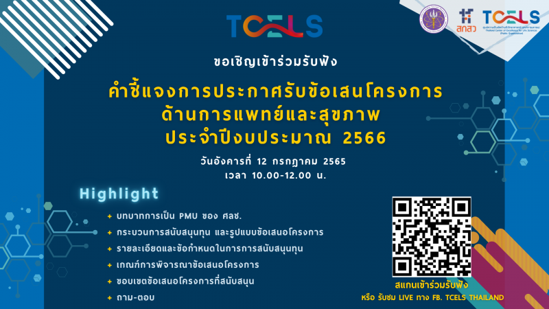 กระทรวงการอุดมศึกษา วิทยาศาสตร์ วิจัยและนวัตกรรม โดย ศูนย์ความเป็นเลิศด้านชีววิทยาศาสตร์ (องค์การมหาชน) หรือ ทีเซลส์ (TCELS) ขอเชิญชวนนักวิจัยและผู้สนใจ เข้าร่วมรับฟังคำชี้แจงการประกาศรับข้อเสนอโครงการด้านการแพทย์และสุขภาพ ประจำปีงบประมาณ 2566 ในวันอังคารที่ 12 กรกฎาคม 2565 เวลา 10.00 - 12.00 น. โดยผ่านระบบออนไลน์ Microsoft Teams