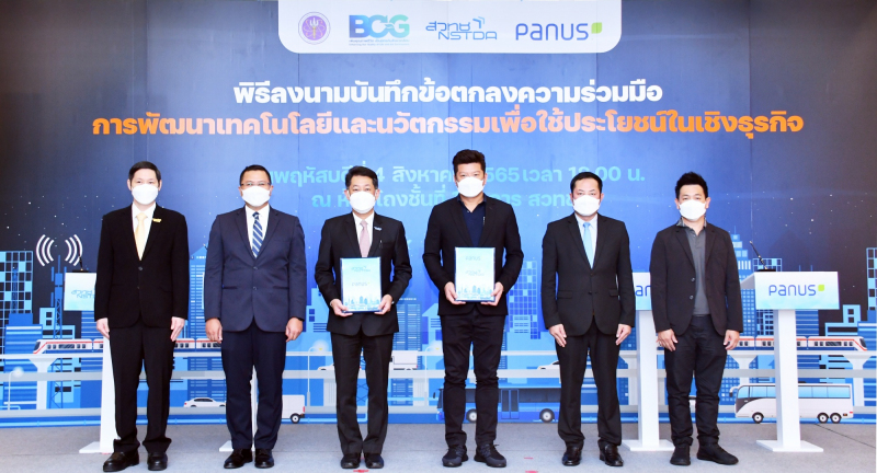 (วันที่ 4 สิงหาคม 2565) ณ ห้องโถงชั้นที่ 1 อาคาร สวทช. ถนนพระรามที่ 6 : ดร.ณรงค์ ศิริเลิศวรกุล ผู้อำนวยการสำนักงานพัฒนาวิทยาศาสตร์และเทคโนโลยีแห่งชาติ (สวทช.) ดร.เอกรัตน์ ไวยนิตย์ ผู้อำนวยการศูนย์วิจัยเทคโนโลยีระบบรางและการขนส่งสมัยใหม่ สวทช. และดร.ศิวรักษ์ ศิวโมกษธรรม ผู้อำนวยการศูนย์เทคโนโลยีเพื่อความมั่นคงของประเทศและการประยุกต์เชิงพาณิชย์ สวทช. ร่วมพิธีลงนามบันทึกข้อตกลงความร่วมมือ การพัฒนาเทคโนโลยีและนวัตกรรมเพื่อใช้ประโยชน์ในธุรกิจอุตสาหกรรมระหว่าง สวทช.และ บริษัท พนัส แอสเซมบลีย์ จำกัด นำโดย นายพนัส วัฒนชัย ประธานกรรมการบริหาร บริษัท พนัส แอสเซมบลีย์ จำกัด คุณเกริก กลมเกลียว ผู้จัดการฝ่ายวิศวกรรม และดร.วิมล แสนอุ้ม ผู้อำนวยการหน่วยธุรกิจนวัตกรรม บริษัท พนัส แอสเซมบลีย์ จำกัด เข้าร่วมงานและเป็นสักขีพยานในการลงนาม