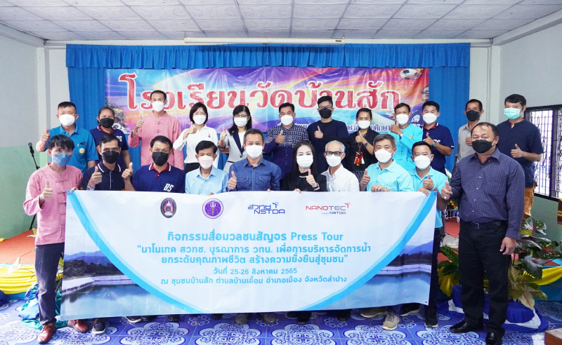 สำนักงานพัฒนาวิทยาศาสตร์และเทคโนโลยีแห่งชาติ (สวทช.) โดย ศูนย์นาโนเทคโนโลยีแห่งชาติ (นาโนเทค) นำโดย ดร.วรรณี ฉินศิริกุล ผู้อำนวยการนาโนเทค พร้อมด้วย ดร.ณัฏฐพร พิมพะ หัวหน้าทีมวิจัยนาโนเทคโนโลยีเพื่อสิ่งแวดล้อม พาคณะสื่อมวลชนลงพื้นที่ ณ ชุมชนบ้านสัก ต.บ้านเอื้อม อ.เมือง จ.ลำปาง พื้นที่นำร่องการบูรณาการวิทยาศาสตร์ เทคโนโลยี และนวัตกรรม (วทน.) เพื่อการบริหารจัดการน้ำ ทั้งน้ำดื่ม น้ำใช้ และน้ำเพื่อการเกษตร แก้ปัญหาด้วยการประยุกต์ใช้สิ่งรอบตัว อาทิ ไส้กรองน้ำจากเซรามิค ของเหลือใช้ในชุมชน หรือเทคโนโลยีการตรวจวัดคุณภาพน้ำอย่างง่ายที่อาศัยพืชใกล้ตัวอย่างต้นกระถิน โดยมหาวิทยาลัยราชภัฏลำปาง พันธมิตรร่วมโครงการ