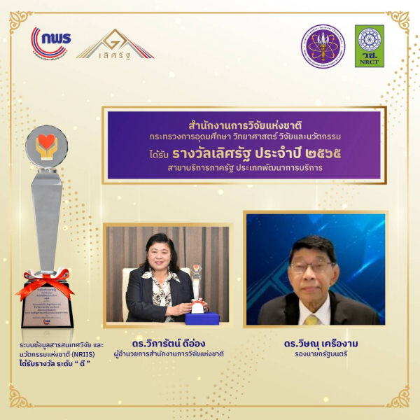 ล่าสุดผลงานระบบข้อมูลสารสนเทศวิจัยและนวัตกรรม (NRIIS) จาก วช. ได้รับรางวัล "เลิศรัฐ " ประจำปี 2565 สาขาบริการภาครัฐ ประเภทพัฒนาการบริการ กองระบบและบริหารข้อมูลเชิงยุทธศาสตร์ ด้านวิทยาศาสตร์ วิจัยและนวัตกรรม ซึ่งจัดโดยสำนักงานคณะกรรมการพัฒนาระบบราชการ (ก.พ.ร.) โดยการมอบรางวัลผ่านสื่ออิเล็กทรอนิกส์ ซึ่งแสดงถึงความทันสมัย กลไกการทำงาน พร้อมให้บริการงานวิจัยเชิงยุทธศาสตร์วิจัยและนวัตกรรมและอำนวยความสะดวกแก่ประชาชนอย่างเต็มที่