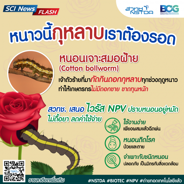 ไบโอเทค สวทช. ขอเสนอ ‘ชีวภัณฑ์ไวรัส NPV (Nuclear Polyhedrosis Virus: NPV)’ เป็นทางเลือกในการกำจัดแมลงศัตรูพืช โดย NPV เป็นไวรัสที่ก่อให้เกิดโรคในแมลง ไม่มีสารพิษตกค้างในพืช ปลอดภัยต่อผู้ใช้งานและสิ่งแวดล้อม ที่สำคัญช่วยลดสารเคมีและค่าใช้จ่ายในระยะยาวได้อีกด้วย