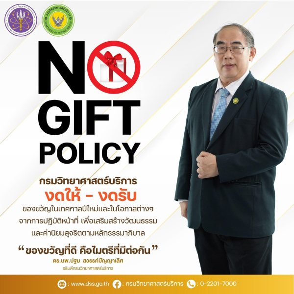 เมื่อวันที่ 15 ธันวาคม 2565 กรมวิทยาศาสตร์บริการ (วศ.) กระทรวงการอุดมศึกษา วิทยาศาสตร์ วิจัยและนวัตกรรม (อว.) โดย ดร.นพ.ปฐม สวรรค์ปัญญาเลิศ อธิบดีกรมวิทยาศาสตร์บริการ ออกประกาศเจตจำนงเป็นหน่วยงานที่เจ้าหน้าที่ของรัฐทุกคนไม่รับของขวัญและของกำนัลทุกชนิด (No Gift Policy) เพื่อเสริมสร้างวัฒนธรรม ค่านิยมสุจริตในการปฏิบัติหน้าที่ให้มีคุณธรรมจริยธรรม ความโปร่งใส ป้องกันการปฏิบัติหน้าที่อย่างไม่เป็นธรรม และเพื่อป้องกันการที่ข้าราชการและเจ้าหน้าที่จะแสวงหาเพื่อให้ได้มาซึ่งของขวัญของกำนัล หรือผลประโยชน์ที่มิชอบด้วยกฎหมาย รวมทั้งลดโอกาสในการรับสินบน ผลประโยชน์ทับซ้อนในรูปแบบต่างๆ