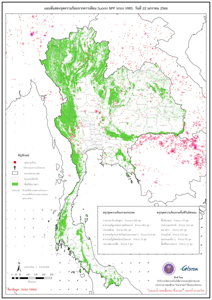 GISTDA เผยข้อมูลจากดาวเทียมซูโอมิ เอ็นพีพี (Suomi NPP) ของระบบเวียร์ (VIIRS) ไทยพบจุดความร้อนเมื่อวานนี้ (22 ม.ค. 66) จำนวน 681 จุด ในขณะที่ประเทศเพื่อนบ้านอย่างราชอาณาจักรกัมพูชาพบจุดความร้อนกว่า 1,300 จุด เมียนมาร์ 965 จุด สปป.ลาว 612 จุด เวียดนาม 72 จุด และมาเลเซีย 5 จุด สำหรับจุดความร้อนในประเทศไทยส่วนใหญ่เกิดขึ้นในพื้นที่เกษตรกรรมจำนวน 176 จุด ป่าสงวน 143 จุด สปก. 141 จุด ชุมชนและอื่น ๆ 92 จุด และริมทางหลวง 11 จุด