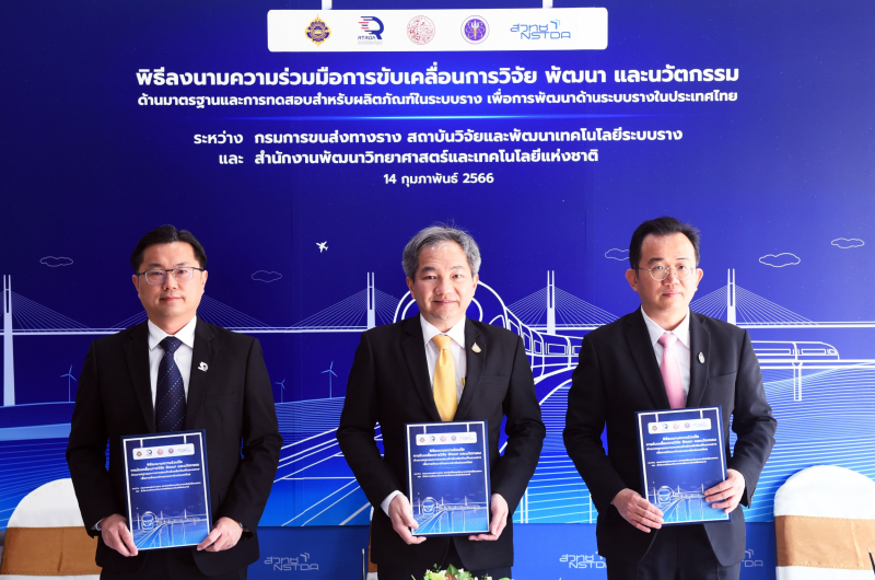 (14 กุมภาพันธ์ 2566) : ศาสตราจารย์ ดร.ชูกิจ ลิมปิจำนงค์ ผู้อำนวยการสำนักงานพัฒนาวิทยาศาสตร์และเทคโนโลยีแห่งชาติ (สวทช.) กระทรวงการอุดมศึกษา วิทยาศาสตร์ วิจัยและนวัตกรรม (อว.) ดร.พิเชฐ คุณาธรรมรักษ์ อธิบดีกรมการขนส่งทางราง (ขร.) และ ดร.สันติ เจริญพรพัฒนา ผู้อำนวยการสถาบันวิจัยและพัฒนาเทคโนโลยีระบบราง (องค์การมหาชน) หรือ สทร. กระทรวงคมนาคม ร่วมลงนามความร่วมมือการขับเคลื่อนการวิจัยพัฒนา นวัตกรรมด้านมาตรฐานและการทดสอบ สำหรับผลิตภัณฑ์ในระบบราง เพื่อการยกระดับผลิตภัณฑ์ให้สอดคล้องกับการพัฒนาด้านระบบรางในประเทศไทย ที่อาคารแชมเบอร์ 10 เมตร อุทยานวิทยาศาสตร์ประเทศไทย จ.ปทุมธานี