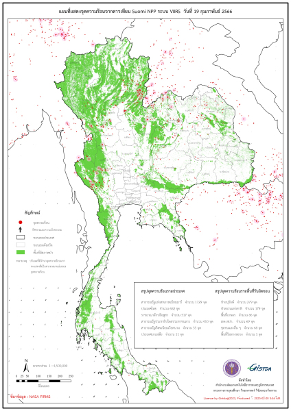 สำหรับจุดความร้อนในประเทศไทยส่วนใหญ่พบในพื้นที่ป่าอนุรักษ์ 279 จุด ป่าสงวนแห่งชาติ 179 จุด พื้นที่เกษตร 86 จุด พื้นที่เขต สปก. 69 จุด ชุมชนและอื่นๆ 68 จุด และริมทางหลวง 4 จุด จังหวัดที่พบจุดความร้อนมากที่สุดคือ #กาญจนบุรี 123 จุด, #อุตรดิตถ์ 60 จุด และ #เลย 55 จุด ตามลำดับ