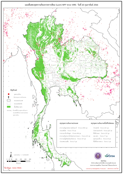 สำหรับจุดความร้อนในประเทศไทยส่วนใหญ่พบในพื้นที่ป่าอนุรักษ์ 261 จุด ป่าสงวนแห่งชาติ 225 จุด พื้นที่เกษตร 107 จุด พื้นที่เขต สปก. 77 จุด ชุมชนและอื่นๆ 64 จุด และริมทางหลวง 1 จุด จังหวัดที่พบจุดความร้อนมากที่สุดคือ #อุตรดิตถ์ 88 จุด, #ตาก 73 จุด และ #เลย 62 จุด ตามลำดับ