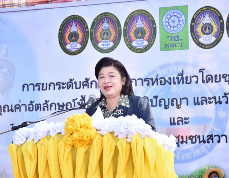 ดร.วิภารัตน์ ดีอ่อง ผู้อำนวยการสำนักงานการวิจัยแห่งชาติ กล่าวว่า วช. ได้ให้การสนับสนุนทุนวิจัยในแผนงานการส่งเสริมกลไกมหาวิทยาลัยในพื้นที่เพื่อพัฒนาผลิตภัณฑ์ท้องถิ่น แก่มหาวิทยาลัยราชภัฏสุรินทร์ และเครือข่ายมหาวิทยาลัยราชภัฏกลุ่มอีสานล่าง ในการดำเนินงาน “โครงการยกระดับศักยภาพการท่องเที่ยวโดยชุมชนเชิงนวัตกรรมเพื่อสร้างคุณค่าอัตลักษณ์พื้นถิ่นด้วยภูมิปัญญาและนวัตกรรมบนฐานเศรษฐกิจ BCG” มุ่งเน้นการมีส่วนร่วม การสร้างระบบการจัดการ และมุ่งสู่มาตรฐานของผลิตภัณฑ์ชุมชน โดยใช้ทิศทาง BCG มาเป็นเป้าหมายร่วมในการดำเนินงานโดยใช้วิจัยและนวัตกรรม ขับเคลื่อนมาตรฐานผลิตภัณฑ์ให้เกิดโอกาสที่ดีขึ้นและผลสำเร็จในมิติต่างๆของชุมชน