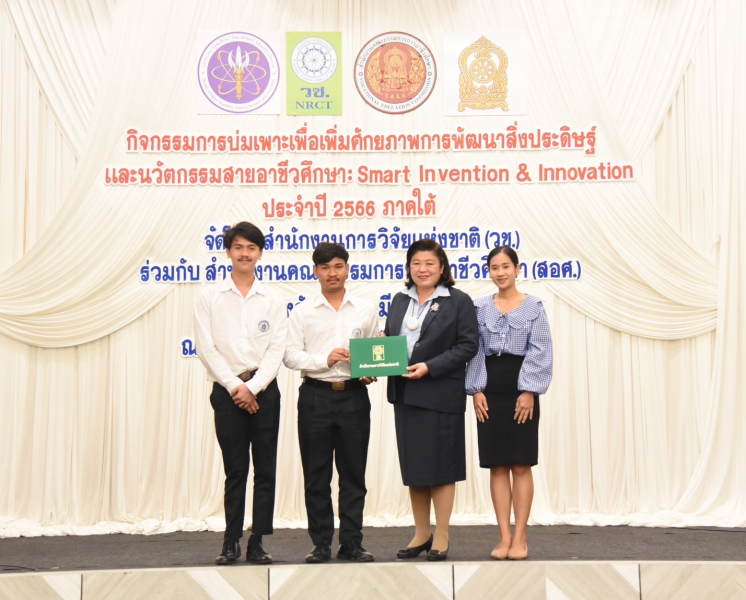 วันที่ 10 มีนาคม 2566 สำนักงานการวิจัยแห่งชาติ (วช.) กระทรวงการอุดมศึกษา วิทยาศาสตร์ วิจัยและนวัตกรรม ร่วมกับ สำนักงานคณะกรรมการการอาชีวศึกษา (สอศ.) จัดพิธีปิดกิจกรรม “การบ่มเพาะเพื่อเพิ่มศักยภาพการพัฒนาสิ่งประดิษฐ์และนวัตกรรมสายอาชีวศึกษา : Smart Invention & Innovation ประจำปี 2566 ภาคใต้” ซึ่งจัดขึ้นระหว่างวันที่ 8 – 10 มีนาคม 2566 และพิธีมอบเกียรติบัตรผลงานติดดาวผลงานเด่นอาชีวศึกษา จำนวน 18 ผลงาน โดยมี ดร.วิภารัตน์ ดีอ่อง ผู้อำนวยการสำนักงานการวิจัยแห่งชาติ เป็นประธานในพิธีปิดกิจกรรมฯ และมอบรางวัลฯ ณ โรงแรมแก้วสมุย รีสอร์ท จังหวัดสุราษฎร์ธานี