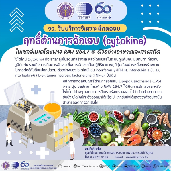 กระทรวงการอุดมศึกษา วิทยาศาสตร์ วิจัยและนวัตกรรม (อว.) สถาบันวิจัยวิทยาศาสตร์และเทคโนโลยีแห่งประเทศไทย (วว.) โดย ศูนย์เชี่ยวชาญนวัตกรรมอาหารสุขภาพ (ศนอ.) ให้บริการวิเคราะห์ทดสอบฤทธิ์ต้านการอักเสบ (cytokine) ในเซลล์แมคโครฟาจ RAW 264.7 ในตัวอย่างอาหารและสารสกัด ซึ่งการวิเคราะห์จะตรวจสอบได้ว่า ตัวอย่างสามารถยับยั้งไซโตไคน์ที่หลั่งออกมาได้หรือไม่ หากยับยั้งได้แสดงว่าตัวอย่างนั้นสามารถลดการอักเสบได้