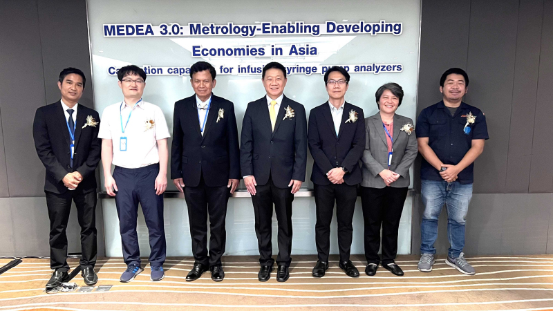 3 เมษายน 2566: พล.ต.ท.พรชัย สุธีรคุณ ผู้อำนวยการ มว. เป็นประธานกล่าวเปิดการประชุม MEDEA 3.0: Metrology - Enabling Developing Economies in Asia Calibration capability for infusion/syringe pump analyzers รูปแบบไฮบริด ซึ่งจัดขึ้นเป็นครั้งที่ 2 โดย ฝ่ายมาตรวิทยาเชิงกล สถาบันมาตรวิทยาแห่งชาติ กระทรวง การอุดมศึกษาวิทยาศาสตร์วิจัยและนวัตกรรม ในหัวข้อ "Testing Procedures of Infusion Pump and Calibration Procedures Guidelines of Infusion Device Analyzer" and "Preparation of Pilot Study on Infusion Device Analyzer Comparison" ภายใต้โครงการ MEDEA3: Metrology - Enabling Developing Economies in Asia หน่วยงานภายใต้การสนับสนุนจาก Physikalisch-Technische Bundesanstalt (PTB) หรือ สถาบันมาตรวิทยา แห่งสหพันธ์สาธารณรัฐเยอรมนี เพื่อให้ผู้เข้าร่วมโครงการในกลุ่มประเทศ DEC (Developing Economies Committee) และ APMP (Asia Pacific Metrology Programme) รวมถึงหน่วยงานภาครัฐและเอกชนของไทย อาทิกรมวิทยาศาสตร์การแพทย์ มหาวิทยาลัยรังสิต และบริษัทผลิตเครื่องมือแพทย์ ได้ร่วมหารือเชิงปฏิบัติการสำหรับการกำหนดแนวทางวิธีการมาตรฐานในการทดสอบและสอบเทียบเครื่องควบคุมการให้สารละลายทางหลอดเลือดดำและเครื่องวิเคราะห์เครื่องควบคุมการให้สารละลายทางหลอดเลือดดำ เพื่อแลกเปลี่ยนเรียนรู้พัฒนาศักยภาพและเพิ่มขีดความสามารถด้านการวัดให้สอดคล้องกับความก้าวหน้าทางเทคโนโลยีที่นำไปต่อยอดพัฒนาศักยภาพของเครื่องมือแพทย์ไทยให้ได้มาตรฐานที่สากลยอมรับ ณ โรงแรมเซ็นทารา แกรนด์ แอท เซ็นทรัลพลาซ่าลาดพร้าว กรุงเทพฯ (วันที่ 3-4 เม.ย. 66) และ มว. คลองห้า จ.ปทุมธานี (วันที่ 5 เม.ย. 66)