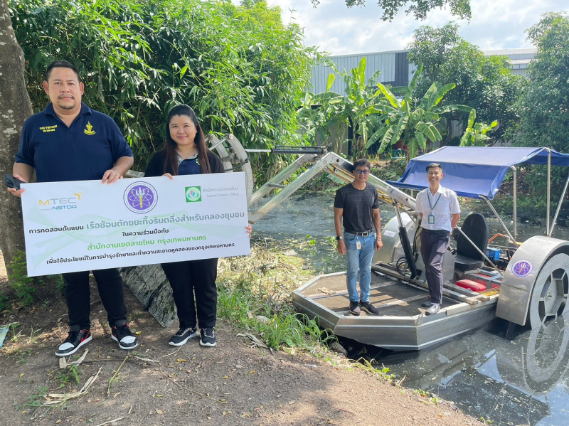 นายดุสิต ตั้งพิสิฐโยธิน วิศวกรอาวุโส MTEC สวทช. พัฒนาเรือช้อนตักขยะผิวน้ำขนาดเล็ก ขนาดกว้าง 3 เมตร ยาว 4.8 เมตร ต้นกำลังเป็นเครื่องยนต์เบนซินสูบเดียวขนาด 11 แรงม้า มีความเร็วในการขับเคลื่อนสูงสุดเท่ากับ 4.46 กิโลเมตรต่อชั่วโมง ความเร็วรอบเครื่องยนต์เท่ากับ 2,800 รอบต่อนาที รัศมีวงเลี้ยวเท่ากับ 3.3 เมตร มีชุดกระบอกไฮดรอลิก 2 ชุด สำหรับควบคุมแขนบูมและบุ้งกี๋ช้อนขยะที่อยู่ทางด้านหน้าของเรือ ขนาด 2 x 1 x 1 เมตร รับน้ำหนักได้มากสุด 100 กิโลกรัม สามารถยกเทได้ความสูงเท่ากับ 2.5 เมตรจากพื้นด้านบนเรือ ซึ่งเป็นความสูงที่เหมาะสมสำหรับยกเทขยะและวัชพืชผิวน้ำไว้บนตลิ่งของคลองที่พบทั่วไป โดยได้มีการประสานงานและทำงานร่วมกับเจ้าหน้าที่เขตอย่างต่อเนื่อง เพื่อเก็บข้อมูลที่ได้จากการทดสอบไปใช้ในการพัฒนาต่อยอด โดยจะมีการปรับเปลี่ยนเครื่องยนต์ให้ประหยัดน้ำมันมากขึ้น ปรับกระบอกไฮโดรลิกส์ให้รับน้ำหนักโหลดได้มากขึ้น และในระยะต่อไปมีแผนจะปรับรูปแบบเรือให้มีตะแกรงเก็บขยะและเศษวัชพืชที่บนเรือได้ เพื่อใช้ในกรณีใช้งานในพื้นที่ที่ไม่มีตลิ่ง และจะผลักดันให้เกิดการใช้ประโยชน์ในวงกว้างต่อไป