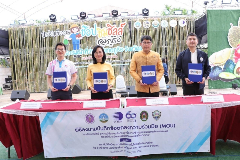 ดร.ชุติมา เอี่ยมโชติชวลิต ผู้ว่าการ สถาบันวิจัยวิทยาศาสตร์และเทคโนโลยีแห่งประเทศไทย (วว.) กระทรวงการอุดมศึกษา วิทยาศาสตร์ วิจัยและนวัตกรรม (อว.) ลงนามบันทึกข้อตกลงความร่วมมือ "การใช้เทคโนโลยี ผลงานวิจัย และนวัตกรรม เพื่อการสร้างมูลค่าเพิ่มผลผลิตการเกษตรไม้ดอกไม้ประดับและพืชอัตลักษณ์ของจังหวัดเลย" กับ นายทวี เสริมภักดีกุล ผู้ว่าราชการจังหวัดเลย ดร.สัญชัย เกียรติทรงชัย ผอ.สถาบันวิจัยและพัฒนา มหาวิทยาลัยราชภัฏเลย และนายธเนศ หาญถนอม ประธานหอการค้าจังหวัด เพื่อขยายขอบข่ายความร่วมมือการขับเคลื่อนการใช้วิทยาศาสตร์ เทคโนโลยีและนวัตกรรม ในการพัฒนาผลิตภัณฑ์หรือบริการจากทรัพยากรที่มีความเป็นอัตลักษณ์ของจังหวัดเลย ให้เกิดการใช้ประโยชน์อย่างคุ้มค่า ร่วมกันอนุรักษ์ทรัพยากรธรรมชาติ รวมทั้งหาแนวทางการใช้ประโยชน์เพื่อให้เกิดมูลค่าทางเศรษฐกิจอย่างสูงสุดและขับเคลื่อนเศรษฐกิจของชุมชนอย่างยั่งยืน ที่ผ่านมาการดำเนินงานภายใต้ความร่วมมือ ประสบผลสำเร็จในการส่งเสริม สนับสนุน ชุมชนให้เข้มแข็ง สามารถสร้างงาน สร้างเงิน ได้อย่างเป็นรูปธรรม