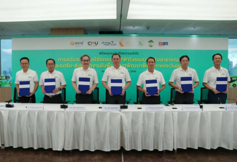 (28 กันยายน 2566) สำนักงานสภานโยบายการอุดมศึกษา วิทยาศาสตร์ วิจัยและนวัตกรรมแห่งชาติ (สอวช.) ร่วมลงนามบันทึกข้อตกลงความร่วมมือ (MoU) เรื่อง การสนับสนุนการใช้รถยนต์ไฟฟ้าในระบบขนส่งสาธารณะ และรถรับ-ส่งพนักงาน ในพื้นที่เขตพัฒนาพิเศษภาคตะวันออก (EEC) ร่วมกับ สำนักงานคณะกรรมการนโยบายเขตพัฒนาพิเศษภาคตะวันออก (สกพอ.) สำนักงานพัฒนาวิทยาศาสตร์และเทคโนโลยีแห่งชาติ (สวทช.) มหาวิทยาลัยเชียงใหม่ ธนาคารเพื่อการส่งออกและนำเข้าแห่งประเทศไทย (EXIM) สมาคมพลังงานหมุนเวียนไทย (อาร์อี100) และมูลนิธิพลังงานสะอาดเพื่อประชาชน ณ สกพอ. ชั้น 25 อาคาร กสท. โทรคมนาคม เขตบางรัก กรุงเทพฯ โดย ดร.กิติพงค์ พร้อมวงค์ ผู้อำนวยการ สอวช. เป็นผู้ร่วมลงนามและกล่าวถึงความร่วมมือระหว่างหน่วยงานในอนาคต