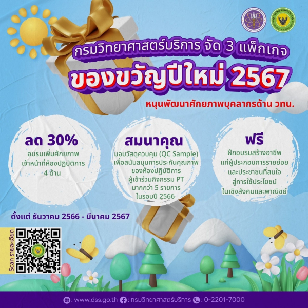 กรมวิทยาศาสตร์บริการ (วศ.) กระทรวงการอุดมศึกษา วิทยาศาสตร์ วิจัยและนวัตกรรม (อว.) จัด 3 แพ็คเกจ “ลด สมนาคุณ ฟรี” งานบริการด้านวิทยาศาสตร์และเทคโนโลยีเพื่อเป็นของขวัญปีใหม่ 2567 แก่ผู้รับบริการและพี่น้องประชาชน ตั้งแต่เดือนธันวาคม 2566-มีนาคม 2567
