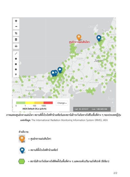 สำนักงานปรมาณูเพื่อสันติ (ปส.) ในฐานะประเทศภาคีภายใต้อนุสัญญาการแจ้งเหตุทางนิวเคลียร์โดยเร็ว (Convention on Early Notification of a Nuclear Accident) ทบวงการพลังงานปรมาณูระหว่างประเทศ (International Atomic Energy Agency, IAEA) ได้รับรายงานจากหน่วยงานกำกับดูแลความปลอดภัยทางนิวเคลียร์ประเทศญี่ปุ่น (Nuclear Regulation Authority, NRA) ว่า  มีโรงไฟฟ้านิวเคลียร์ที่อยู่ใกล้จุดศูนย์กลางของแผ่นดินไหว จำนวน 6 แห่ง คือ