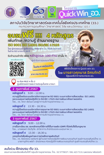 กระทรวงการอุดมศึกษา วิทยาศาสตร์ วิจัย และนวัตกรรม (อว.) โดย สถาบันวิจัยวิทยาศาสตร์และเทคโนโลยีแห่งประเทศไทย (วว.) และสำนักงานการวิจัยแห่งชาติ (วช.) จัดอบรมฟรี ! จำนวน 4 หลักสูตร ภายใต้การดำเนินโครงการ Quick win หรือโครงการเร่งด่วนที่เห็นผลเร็วภายใน 3 เดือน ตามนโยบายของรัฐบาลและนโยบาย นางสาวศุภมาส อิศรภักดี รัฐมนตรีว่าการกระทรวง อว. ดังนี้ 1) ความรู้เบื้องต้นระบบบริหารจัดการคุณภาพ ISO 9001 ระบบการจัดการสิ่งแวดล้อม ISO 14001 และระบบคุณภาพห้องปฏิบัติการ ISO/IEC 17025 ต่อการพัฒนาศักยภาพองค์กร 2) ความรู้เบื้องต้นระบบบริหารจัดการคุณภาพ ISO 900 1 ระบบการจัดการสิ่งแวดล้อม ISO 14001 และระบบคุณภาพห้องปฏิบัติการ ISO/IEC 17025 ต่อการพัฒนาศักยภาพองค์กร 3) การขึ้นทะเบียน อย. และหลักเกณฑ์วิธีการที่ดีในการผลิต (GMP) ที่บังคับใช้เป็นกฎหมาย และ 4) บรรจุภัณฑ์เพื่อเพิ่มมูลค่าและการช่วยยืดอายุผลิตภัณฑ์ โดยรับผู้เข้าอบรมจำนวนจำกัด เพียงหลักสูตรละ 100 ท่าน เท่านั้น **ผู้เข้ารับการอบรม จะได้รับใบประกาศนียบัตร จาก กระทรวง อว.