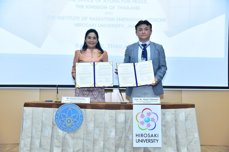 วันที่ 22 มกราคม 2567 นางเพ็ญนภา กัญชนะ รองเลขาธิการ รักษาราชการแทนเลขาธิการสำนักงานปรมาณูเพื่อสันติ และ ศ.ดร. Shinji Tokonami ผู้อำนวยการสถาบันเวชศาสตร์ฉุกเฉินทางรังสี มหาวิทยาลัยฮิโรซากิ ประเทศญี่ปุ่น ลงนามบันทึกความเข้าใจเพื่อการแลกเปลี่ยนข้อมูลทางเทคนิคและความร่วมมือด้านความปลอดภัยทางรังสี ณ ห้องประชุมใหญ่ ปส. โดยมีเจตนารมณ์ร่วมกันในการแลกเปลี่ยนข้อมูลทางวิทยาศาสตร์และเทคโนโลยี รวมทั้งร่วมดำเนินงานวิจัยที่ส่งเสริมและยกระดับความปลอดภัยด้านนิวเคลียร์และรังสี ตลอดจนแลกเปลี่ยนนักวิทยาศาสตร์ วิศวกร นักวิจัย เจ้าหน้าที่ หรือผู้เชี่ยวชาญอื่น ๆ ในการพัฒนาและเสริมประสบการณ์ด้านนิวเคลียร์และรังสี และแลกเปลี่ยนแนวทางปฏิบัติหากเกิดอุบัติเหตุทางนิวเคลียร์และรังสี เพื่อความปลอดภัยสูงสุดต่อทั้งผู้ปฏิบัติงาน ประชาชน และสิ่งแวดล้อม