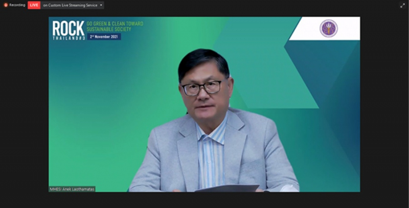 เมื่อวันอังคารที่ 2 พฤศจิกายน 2564 ณ ห้องประชุม รมว.อว. ชั้น 2 อาคารพระจอมเกล้า ศ.(พิเศษ) ดร.เอนก เหล่าธรรมทัศน์ รัฐมนตรีว่าการกระทรวงการอุดมศึกษา วิทยาศาสตร์ วิจัยและนวัตกรรม (รมว.อว.) เข้าร่วมงาน Rock Thailand #3 Go Green & Clean Toward Sustainable Society  และกล่าวปาฐกพิเศษในประเด็นนโยบายโมเดลเศรษฐกิจ BCG โดยเน้นในเรื่องการใช้เทคโนโลยีสีเขียว เพื่อนำไปสู่สังคมคาร์บอนต่ำ ผ่านระบบการประชุมออนไลน์