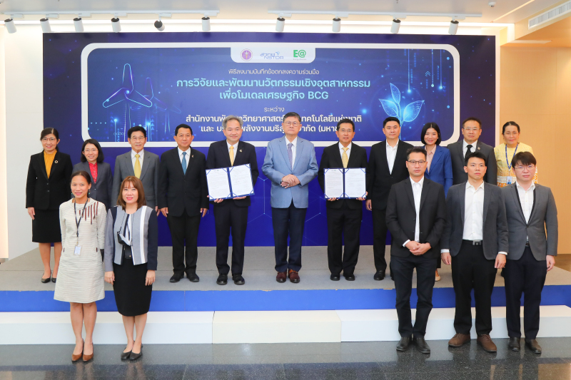 (วันที่ 23 มกราคม 2566) : ศ.ดร.ชูกิจ ลิมปิจำนงค์ ผู้อำนวยการสำนักงานพัฒนาวิทยาศาสตร์และเทคโนโลยีแห่งชาติ (สวทช.) และ นายสมโภชน์ อาหุนัย ประธานเจ้าหน้าที่บริหาร บริษัท พลังงานบริสุทธิ์ จำกัด (มหาชน) หรือ EA ร่วมลงนามบันทึกข้อตกลงความร่วมมือการวิจัยและพัฒนาเพื่อนวัตกรรมเชิงอุตสาหกรรมเพื่อ Bio-Circular-Green Economy โดยมี ศ. (พิเศษ) ดร.เอนก เหล่าธรรมทัศน์ รัฐมนตรีว่าการกระทรวงการอุดมศึกษา วิทยาศาสตร์ วิจัยและนวัตกรรม (อว.) ร่วมแสดงความยินดี พร้อมด้วย ศ.ดร.นพ.สิริฤกษ์ ทรงศิวิไล ปลัดกระทรวงการอุดมศึกษา วิทยาศาสตร์ วิจัยและนวัตกรรม ณ โถงชั้น 1 สำนักงานพัฒนาวิทยาศาสตร์และเทคโนโลยีแห่งชาติ (อาคารโยธี)
