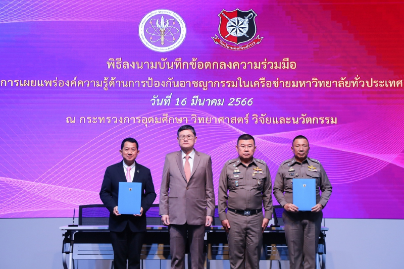 เมื่อวันที่ 16 มี.ค. ศ.(พิเศษ) ดร.เอนก เหล่าธรรมทัศน์ รมว.การอุดมศึกษา วิทยาศาสตร์ วิจัยและนวัตกรรม (อว.) เป็นประธานในพิธีลงนามบันทึกข้อตกลงความร่วมมือ “การเผยแพร่องค์ความรู้ด้านการป้องกันอาชญากรรมในเครือข่ายมหาวิทยาลัยทั่วประเทศ” ระหว่างกระทรวง อว. กับโรงเรียนนายร้อยตำรวจ โดยมี พล.ต.อ. ดำรงศักดิ์ กิตติประภัสร์ ผู้บัญชาการตำรวจแห่งชาติ เข้าร่วม ทั้งนี้ มี ศ.ดร.นพ.สิริฤกษ์ ทรงศิวิไล ปลัดกระทรวง อว. และ พล.ต.ท.เสนิต สำราญสำรวจกิจ ผู้บัญชาการโรงเรียนนายร้อยตำรวจ เป็นผู้ร่วมลงนาม ที่สำนักงานปลัดกระทรวง อว.
