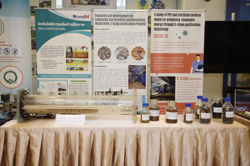 - ต้นแบบและศูนย์การเรียนรู้ด้านการจัดการ PPE ใช้แล้วที่ผ่านการฆ่าเชื้อจากการแพร่ระบาดของโรคติดเชื้อโควิด-19 และขยะปลอดเชื้ออื่นๆ ให้เป็นพลังงานไฟฟ้า ด้วยเทคโนโลยีแก๊สซิฟิเคชันสามขั้นตอน โดยการสนับสนุนของ บพข. โดยระบบมีประสิทธิภาพสูง เกิดมลพิษต่ำกว่าการเผาไหม้ทั่วไป มีศักยภาพรองรับวัตถุดิบ 10 ตันต่อวัน โดย วว. มุ่งถ่ายทอดองค์ความรู้และเทคโนโลยีให้แก่ผู้สนใจ เพื่อใช้เป็นต้นแบบสำหรับโรงไฟฟ้าขยะชุมชน ช่วยลดผลกระทบด้านสุขอนามัยชุมชน สิ่งแวดล้อมโดยรวมอย่างยั่งยืน รวมทั้งนำเสนอต้นแบบถังปฏิกิริยาผลิตก๊าซชีวภาพแบบแห้งแนวนอน