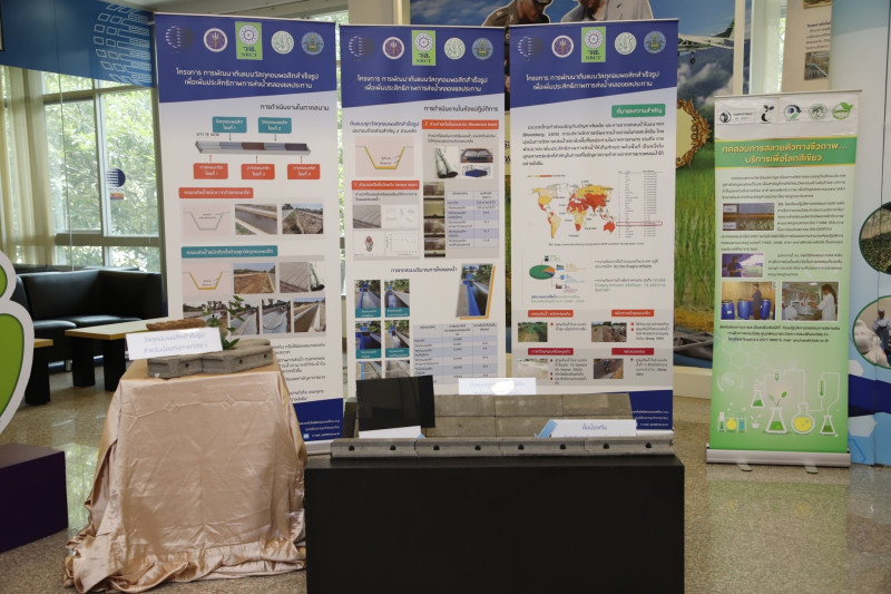 - ศูนย์เชี่ยวชาญนวัตกรรมวัสดุ จัดแสดง เทคโนโลยีเพื่อบริหารจัดการการขาดแคลนน้ำ ได้แก่ วัสดุคอมพอสิตสำเร็จรูปสำหรับป้องกันการกัดเซาะ ซึ่ง วว. ได้รับทุนสนับสนุนจาก วช. ช่วยเพิ่มประสิทธิภาพการส่งน้ำคลองชลประทาน ลดการสูญเสียน้ำ บรรเทาปัญหาการขาดแคลนน้ำ ประกอบด้วย ต้นแบบชุดวัสดุคอมพอสิตสำเร็จรูปเพื่อการส่งน้ำ ชั้นป้องกันในการรับแรงอัด/แรงแรงเฉือนจากการไหลของน้ำ และชั้นเมมเบรน ป้องกันการรั่วซึมของน้ำและกักเก็บผิวดิน