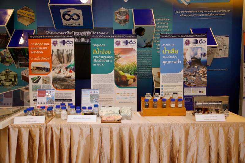 วัสดุกรองสีน้ำอ้อยจากเถ้าชานอ้อยเพื่อผลิตน้ำตาลทรายขาว โดย วว. ร่วมกับบริษัท ดิจิทรานส์ โซลูชั่นส์ จำกัด โดยการสนับสนุนจาก บพข. ช่วยลดขั้นตอนกระบวนการผลิต ลดการใช้พลังงาน ลดการสูญเสียน้ำอ้อยระหว่างกระบวนการผลิตได้ ลดการใช้สารเคมีทั้งกระบวนการเติมปูนขาว ก๊าซคาร์บอนไดออกไซด์ และเรซิ่น หากขยายผลสู่อุตสาหกรรมจะสามารถผลิตวัสดุกรองสีจากของเหลือทิ้งประเภทเถ้าให้เกิดผลิตภัณฑ์ทางเลือกเพื่อลดการนำเข้าและสามารถส่งออกเพิ่มขีดความสามารถในการแข่งขันตามหลักเศรษฐกิจหมุนเวียน (Circular Economy)