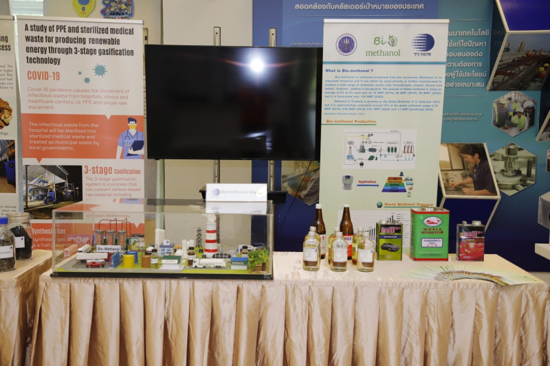 - ศูนย์เชี่ยวชาญนวัตกรรมพลังงานสะอาดและสิ่งแวดล้อม นำเสนอ กระบวนการผลิตไบโอเมทานอล (Biomethanol) หรือกรีนเมทานอล ซึ่งใช้สารตั้งต้นชีวภาพในการผลิต อาทิ ก๊าซชีวภาพ ก๊าซคาร์บอนไดออกไซด์ (CO2) โดยวิจัยและพัฒนามาตั้งแต่ปี 2557 ทำการศึกษาวิจัยและพัฒนากระบวนการผลิตไบโอเมทานอลตั้งแต่ระดับ 0.025 ลิตร/วัน เมื่อสำเร็จจึงขยายขนาดกำลังการผลิตเป็น 1 ลิตร/วัน และ 5 ลิตร/วัน ขณะนี้ได้ดำเนินการจดสิทธิบัตรเป็นที่เรียบร้อย พร้อมถ่ายทอดเทคโนโลยีและขยายผลสู่การผลิตภาคอุตสาหกรรม
