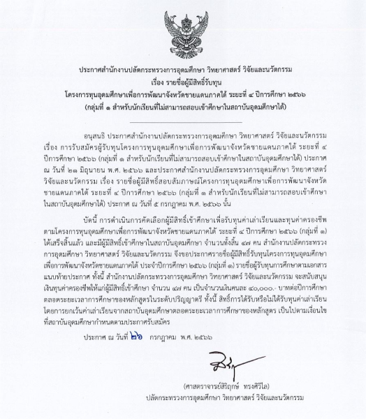 ประกาศรายชื่อผู้มีสิทธิ์รับทุนโครงการอุดมศึกษาเพื่อการพัฒนาจังหวัดชายแดนภาคใต้ ระยะที่ 4 (กลุ่ม 1)