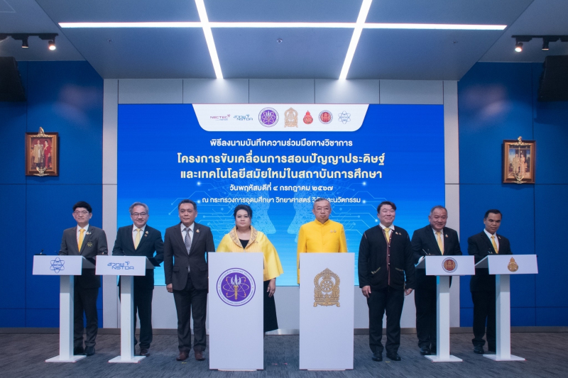 เมื่อวันที่ 4 ก.ค. นางสาวศุภมาส อิศรภักดี รัฐมนตรีว่าการกระทรวงการอุดมศึกษา วิทยาศาสตร์ วิจัยและนวัตกรรม (อว.) และ พลตำรวจเอก เพิ่มพูน ชิดชอบ รัฐมนตรีว่าการกระทรวงศึกษาธิการ (ศษ.) เป็นประธานพิธีลงนามบันทึกความร่วมมือทางวิชาการ “โครงการขับเคลื่อนการสอนปัญญาประดิษฐ์และเทคโนโลยีสมัยใหม่ในสถาบันการศึกษา” ระหว่าง สำนักงานคณะกรรมการการศึกษาขั้นพื้นฐาน (สพฐ.) สำนักงานคณะกรรมการการอาชีวศึกษา (สอศ.) สถาบันส่งเสริมการสอนวิทยาศาสตร์และเทคโนโลยี (สสวท.) และ สำนักงานพัฒนาวิทยาศาสตร์และเทคโนโลยีแห่งชาติ (สวทช.) โดยมีนายสิริพงศ์ อังคสกุลเกียรจิ ผู้ช่วยรัฐมนตรี ศธ. นายเพิ่มสุข สัจจาภิวัฒน์ ปลัดกระทรวง อว. เป็นสักขีพยาน และศาสตราจารย์ ชูกิจ ลิมปิจำนงค์ ผู้อำนวยการ สวทช. กล่าวรายงานกรอบแนวทางความร่วมมือ ณ ห้องแถลงข่าว ชั้น 1 อาคารพระจอมเกล้า สป.อว. (โยธี)