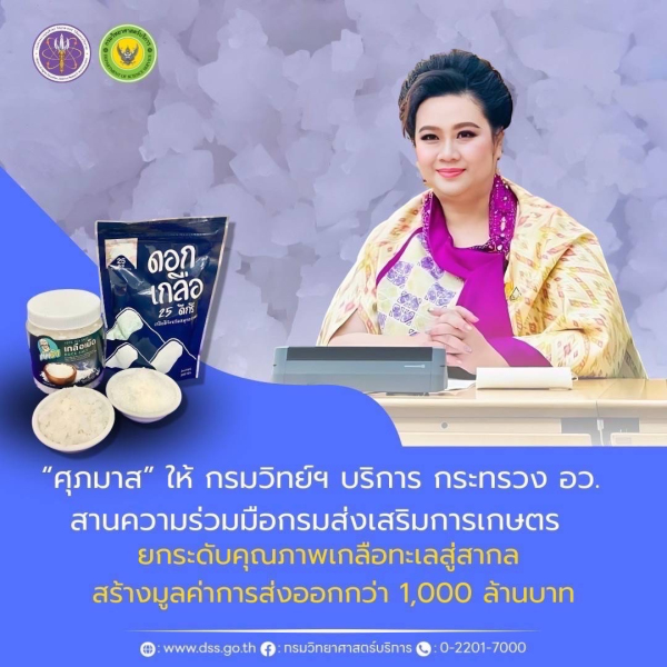 นางสาวศุภมาส อิศรภักดี รัฐมนตรีว่าการกระทรวงการอุดมศึกษา วิทยาศาสตร์ วิจัยและนวัตกรรม (อว.) กล่าวว่า ตนมีนโยบายในการยกระดับและขับเคลื่อนการพัฒนาเศรษฐกิจ สังคม และคุณภาพชีวิตประชาชนอย่างยั่งยืนด้วยการนำองค์ความรู้ทางวิทยาศาสตร์และเทคโนโลยีมาสนับสนุนการดำเนินงานตามยุทธศาสตร์ชาติด้านการเพิ่มขีดความสามารถในการแข่งขัน ยกระดับมาตรฐานสินค้าและส่งเสริมการพัฒนาคุณภาพสินค้าของเกษตรกรและชุมชน จึงได้มอบหมายกรมวิทยาศาสตร์บริการ (วศ.) ยกระดับคุณภาพเกลือทะเลไทยให้สามารถส่งออกสู่ตลาดโลก เพื่อส่งเสริมให้เกษตรกรมีรายได้ ยกระดับคุณภาพชีวิต โดยสืบสานการบูรณาการร่วมกับกรมส่งเสริมการเกษตร