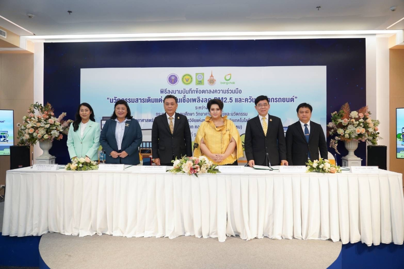 เมื่อวันที่ 9 ส.ค. นางสาวศุภมาส อิศรภักดี รัฐมนตรีว่าการกระทรวงการอุดมศึกษา วิทยาศาสตร์ วิจัยและนวัตกรรม (อว.) ให้เกียรติเป็นสักขีพยานการลงนามบันทึกข้อตกลงความร่วมมือ (MOU) การผลักดันผลงานวิจัยและนวัตกรรม เพื่อเสริมสร้างคุณภาพชีวิตและสร้างอากาศสะอาดเพื่อคนไทย พร้อมด้วย นายเพิ่มสุข สัจจาภิวัฒน์ ปลัดกระทรวง อว., พ.ญ.เพชรดาว โต๊ะมีนา ที่ปรึกษารัฐมนตรีว่าการกระทรวง อว. และ ศ.เกียรติคุณ ดร.นพ.สิริฤกษ์ ทรงศิวิไล ประธานคณะกรรมการส่งเสริมวิทยาศาสตร์ วิจัยและนวัตกรรม โดยมี นายแพทย์รุ่งเรือง กิจผาติ อธิบดีกรมวิทยาศาสตร์บริการ (วศ.), ดร.วิภารัตน์ ดีอ่อง ผู้อำนวยการสำนักงานการวิจัยแห่งชาติ (วช.), รศ.ดร.บัณฑิต กฤตาคม รองอธิการบดีฝ่ายวิจัย พัฒนานวัตกรรมและบริการวิชาการ มหาวิทยาลัยเทคโนโลยีราชมงคลอีสาน และ คุณกัณฑมาศ กฤตยานุกูล ผู้ช่วยกรรมการผู้จัดการใหญ่ สายงานการผลิต บริษัทบางจาก คอร์ปอเรชั่น จำกัด (มหาชน) ร่วมลงนาม ณ ห้องแถลงข่าว ชั้น 1 สำนักงานพัฒนาวิทยาศาสตร์และเทคโนโลยีแห่งชาติ กระทรวง อว.