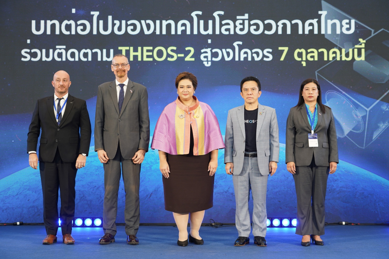 เมื่อวันที่ 27 ก.ย. นางสาวศุภมาส อิศรภักดี รัฐมนตรีว่าการกระทรวงการอุดมศึกษา วิทยาศาสตร์ วิจัยและนวัตกรรม (อว.) พร้อมด้วย ศ.ดร.นพ. สิริฤกษ์ ทรงศิวิไล ปลัดกระทรวง อว. ดร.ปกรณ์ อาภาพันธุ์ ผู้อำนวยการสำนักพัฒนาเทคโนโลยีอวกาศและภูมิสารสนเทศ (GISTDA) นายเรมี ล็องแบร์ อุปทูตรักษาการเอกอัครราชทูตฝรั่งเศสประจำประเทศไทย และนายโอลิวิเย่ร์ ชาร์ลเวท จาก AIRBUS ร่วมแถลงข่าวความพร้อมของดาวเทียว THEOS-2 ก่อนขึ้นสู่อวกาศ ในงาน “THEOS-2 : Shaping Thailand’s Future from Space, Our Commitment” ณ Pearl Bangkok กรุงเทพฯ โดยดาวเทียมสำรวจโลก THEOS-2 ของไทยดวงนี้ มีกำหนดการขึ้นสู่อวกาศในวันเสาร์ที่ 7 ตุลาคม 2566 เวลา 8.36 น. (ตามเวลาประเทศไทย) ณ ท่าอวกาศยานยุโรปเฟรนซ์เกียนา (Guiana Space Center) ทวีปอเมริกาใต้