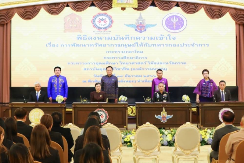 เมื่อวันที่ 19 ธ.ค. ที่ตึกสันติไมตรี ทำเนียบรัฐบาล นายอนุทิน ชาญวีรกูล รองนายกรัฐมนตรีและ รมว.มหาดไทย พร้อมด้วยนายสุทิน คลังแสง รมว.กลาโหม น.ส.ศุภมาส อิศรภักดี รมว.การอุดมศึกษา วิทยาศาสตร์ วิจัยและนวัตกรรม และนายสุรศักดิ์ พันธ์เจริญวรกุล รมช.ศึกษาธิการ เป็นสักขีพยานในพิธีลงนามบันทึกความเข้าใจเรื่อง การพัฒนาทรัพยากรมนุษย์ให้กับทหารกองประจำการ ระหว่างกระทรวงกลาโหม(กห.) กระทรวงการอุดมศึกษา วิทยาศาสตร์ วิจัยและนวัตกรรม (อว.) กระทรวงศึกษาธิการ (ศธ.) และสถาบันคุณวุฒิวิชาชีพ (องค์การมหาชน) โดยมี พล.อ.สนิธชนก สังขจันทร์ ปลัด กห. นายเพิ่มสุข สัจจาภิวัฒน์ ปลัด อว. ดร.สุเทพ แก่งสันเทียะ รักษาราชการแทนปลัด.ศธ. และ น.ส.จุลลดา มีจุล ผอ.สถาบันคุณวุฒิวิชาชีพ เป็นผู้ร่วมลงนาม