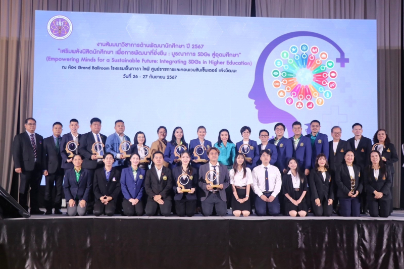 เมื่อวันที่ 27 ก.ย. นางสาววราภรณ์ รุ่งตระการ ที่ปรึกษาด้านระบบบริหาร การอุดมศึกษา วิทยาศาสตร์ วิจัยและนวัตกรรม สำนักงานปลัดกระทรวงการอุดมศึกษา วิทยาศาสตร์ วิจัยและนวัตกรรม (สป.อว.) ได้รับมอบหมายจาก นางสาวศุภมาส อิศรภักดี รัฐมนตรีว่าการกระทรวงการอุดมศึกษา วิทยาศาสตร์ วิจัยและนวัตกรรม (อว.) ให้เป็นประธานปิดงานสัมมนาวิชาการด้านพัฒนานักศึกษา ปี 2567 “เสริมพลังนิสิตนักศึกษา เพื่อการพัฒนาที่ยั่งยืน : บูรณาการ SDGs สู่อุดมศึกษา” (Empowering Minds for a Sustainable Future: Integrating SDGs in Higher Education) พร้อมทั้งมอบรางวัลผลงานนวัตกรรมเพื่อการพัฒนานักศึกษาดีเด่น โดยมี นายสุทน เฉื่อยพุก ผู้อำนวยการกองส่งเสริมและพัฒนากำลังคน สป.อว. ผู้บริหารหน่วยงานในสังกัดกระทรวง อว. บุคลากรทางการศึกษา นิสิตนักศึกษา หน่วยงานทั้งภาครัฐและเอกชน และผู้สนใจกว่า 600 คน เข้าร่วมงาน ณ ชั้น 4 โรงแรมเซ็นทารา ไลฟ์ ศูนย์ราชการ และคอนเวนชันเซ็นเตอร์ แจ้งวัฒนะ
