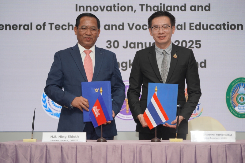 เมื่อวันที่ 30 ม.ค. ศ.ดร.ศุภชัย ปทุมนากุล ปลัดกระทรวงการอุดมศึกษา วิทยาศาสตร์ วิจัยและนวัตกรรม (อว.) พร้อมด้วย นายฮิง ซีเดด ปลัดกรมอาชีวศึกษาและการฝึกอบรม (DGTVET) ประเทศกัมพูชา ร่วมลงนามบันทึกข้อตกลง (Memorandum of Agreement - MoA) การจัดสรรทุนเพื่อพัฒนาทักษะกำลังคนด้านอาชีวศึกษา ระหว่างสำนักงานปลัดกระทรวงการอุดมศึกษา วิทยาศาสตร์ วิจัยและนวัตกรรม (สป.อว.) และ กรม DGTVET กระทรวงแรงงานและการฝึกอบรมวิชาชีพของประเทศกัมพูชา โดยมี ผศ.ดร.คณกร สว่างเจริญ อธิการบดีมหาวิทยาลัยราชภัฏบ้านสมเด็จเจ้าพระยา และรองประธานที่ประชุมอธิการบดีมหาวิทยาลัยราชภัฏ ผู้แทนที่ประชุมอธิการบดีมหาวิทยาลัยราชภัฏ และ ผศ.ดร.นพนภา จุลโลบล รองอธิการบดีมหาวิทยาลัยเทคโนโลยีราชมงคลรัตนโกสินทร์ ผู้แทนที่ประชุมกรรมการอธิการบดีมหาวิทยาลัยเทคโนโลยีราชมงคล เป็นสักขีพยาน ณ ห้องแถลงข่าว ชั้น 1 อาคารพระจอมเกล้า สป.อว. (โยธี)