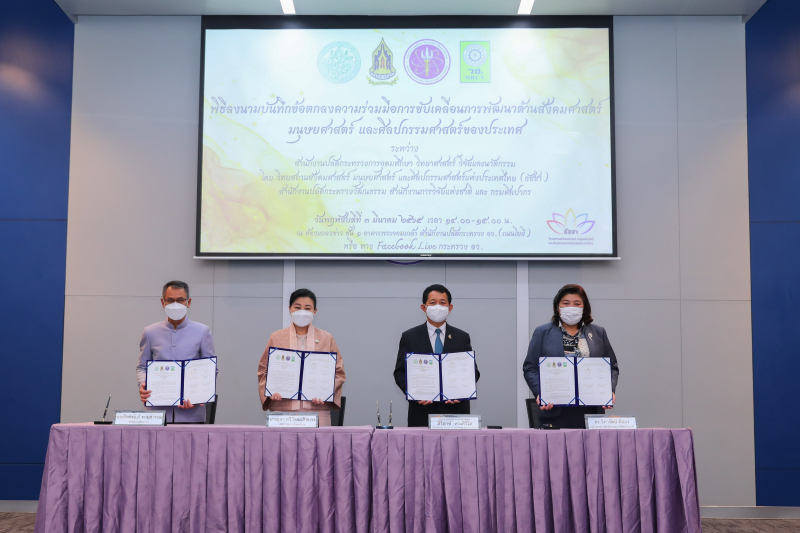วันที่ 3 มีนาคม 2565 : อว. จัดพิธีลงนามบันทึกข้อตกลงความร่วมมือการขับเคลื่อนการพัฒนาด้านสังคมศาสตร์ มนุษยศาสตร์ และศิลปกรรมศาสตร์ของประเทศระหว่าง สำนักงานปลัดกระทรวงการอุดมศึกษา วิทยาศาสตร์ วิจัยและนวัตกรรม โดย วิทยสถานสังคมศาสตร์ มนุษยศาสตร์ และศิลปกรรมศาสตร์แห่งประเทศไทย (ธัชชา) กับ สำนักงานปลัดกระทรวงวัฒนธรรม สำนักงานการวิจัยแห่งชาติ และกรมศิลปากร เพื่อผลักดันความร่วมมือและส่งเสริมกลไกการขับเคลื่อนการพัฒนาด้านสังคมศาสตร์ มนุษยศาสตร์ วัฒนธรรมและศิลปกรรมศาสตร์ของประเทศ เชื่อมโยงองค์ความรู้แบบสหวิทยาการทั้งศาสตร์และศิลป์ พัฒนางานวิจัยใหม่ๆ ที่เชื่อมโยงสอดคล้องกับการเปลี่ยนแปลงของโลกในปัจจุบันและอนาคต สู่การสร้างคุณค่าและผลประโยชน์ของชาติ งานดังกล่าวจัดขึ้นที่ ห้องแถลงข่าวชั้น 1 อาคารพระจอมเกล้า สป.อว. (ถนนโยธี)
